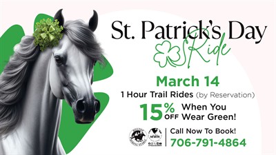 Saddle up for a festive St. Patrick’s Day Horse Trail Ride filled with fresh air, good company, and a touch of Irish luck. This guided ride is a fun way to celebrate the holiday—whether you're coming with friends, family, or enjoying a little solo adventure.